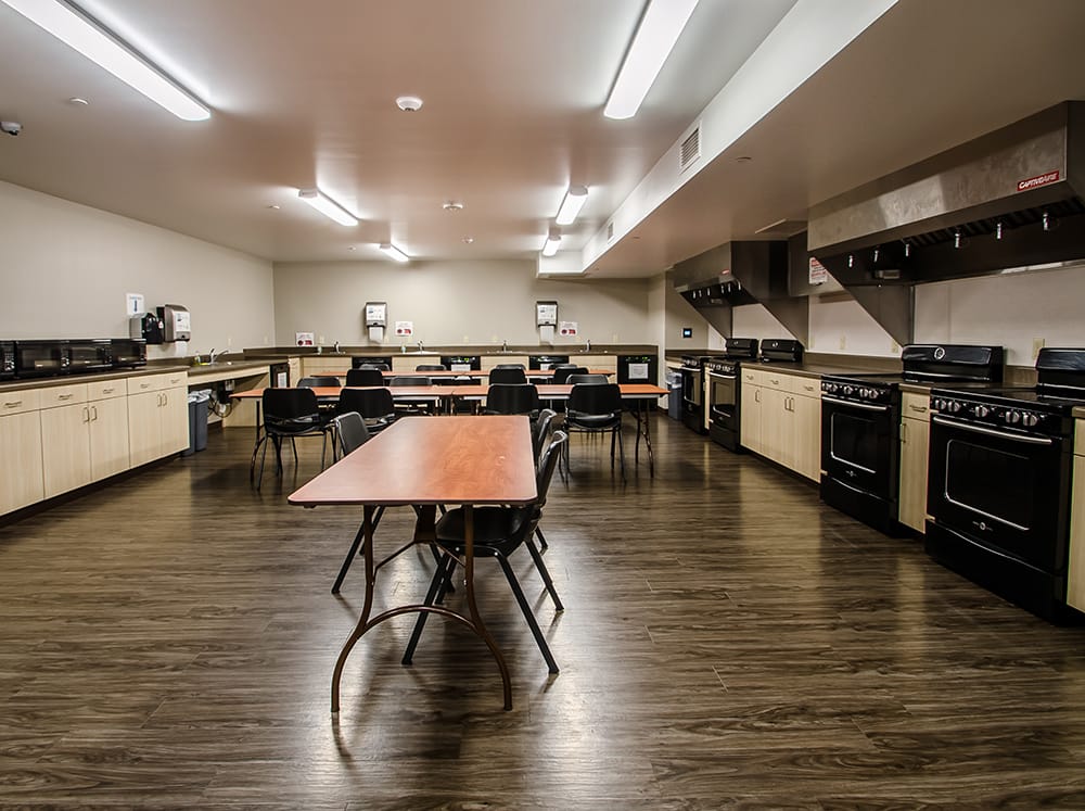 Amenities include multi-station kitchen, large living room, multi-media room, community restrooms with showers and changing rooms, laundry facilities and vending areas. Human Resources offices, main building entrance and lobby/reception areas are located on the second floor, which is at ground level on the sloped site. Resident units include a padlockable closet for each of the 4 occupants, bunk beds, microwave, refrigerator, counters/desktops and overhead shelving.